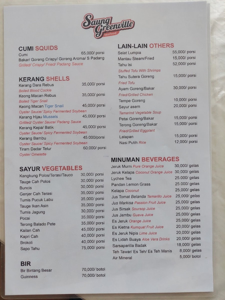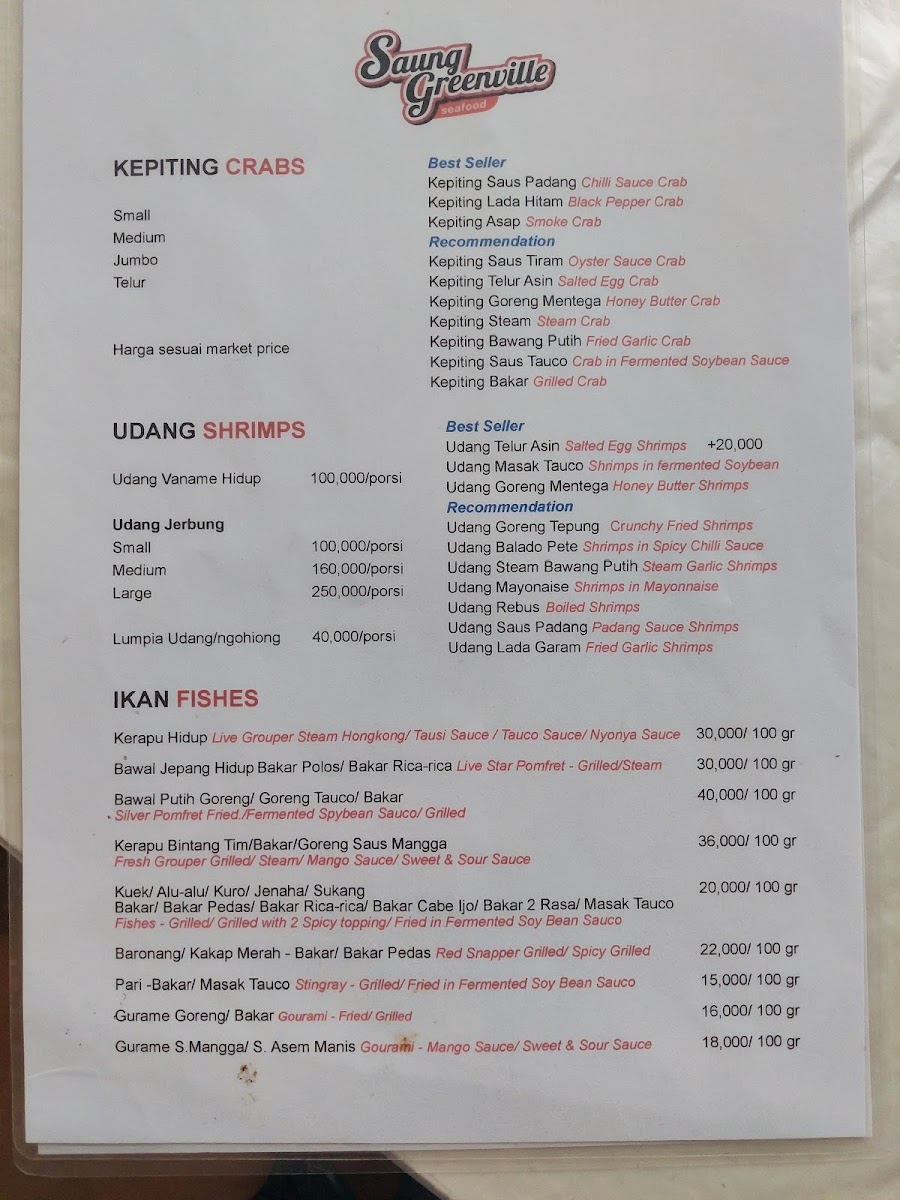 Located in the heart of Jakarta, Saung Greenville is a legendary seafood restaurant celebrated for its fresh and flavorful dishes. Patrons flock here for the iconic Black Pepper Crab, a dish that has garnered rave reviews for its robust peppery flavor. Customers also delight in the sweet yet spicy Padang Sauce Crab, a testament to the restaurant's culinary expertise.